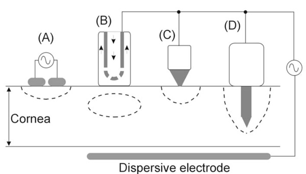 RF electrodes and applicators for creating a lesion at a certain point in the cornea. A: A pair of electrodes cause a lesion by means of a bipolar application. B: The circulating saline electrode (CSE) works by delivering RF currents from the active electrode to a dispersive electrode while a flow of isotonic saline is infused over the cornea surface. C: A small surface electrode is placed on the cornea and RF currents are applied between this and a dispersive electrode. The lesion is hence confined to the cornea surface. D: An intrastromal electrode is a needle-shaped electrode which penetrates from the surface to the central stroma. The lesion has more depth than in the case of a surface electrode (C).