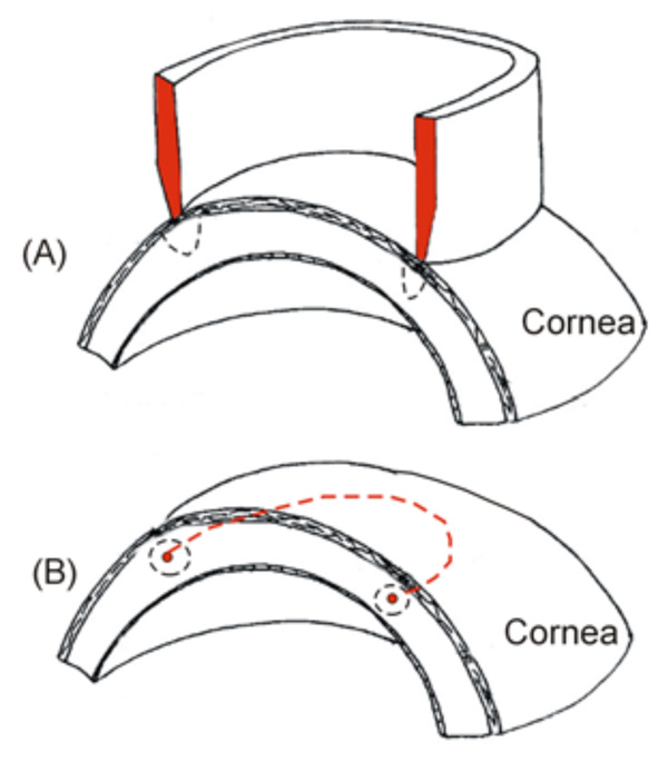 Two types of RF electrodes for creating a circular lesion in the cornea (both use a monopolar system, i.e. the RF current circulates between the electrode and a dispersive electrode, which is not shown). A: A circular electrode placed on the cornea provides a circular lesion pattern. B: A small circular electrode is inserted into the central stroma (red dashed line), providing a toroidal lesion.
