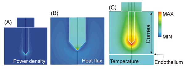 Computer modeling of an intrastromal electrode. This kind of electrode has two important advantages: 1) the RF power is mainly deposited at the electrode tip (see Joule heat in A), and 2) the low thermal conductivity of the electrode metallic body facilitates the transmission of heat from the electrode tip to the anterior zone (see heat flux in B). Note that the maximum heat flux is located in the electrode, and in contrast, the corneal tissue shows a very low heat flux value. A high thermal gradient therefore appears between the electrode tip and endothelium, which provides thermal protection to the endothelium (see temperature in C). Scales are normalized.