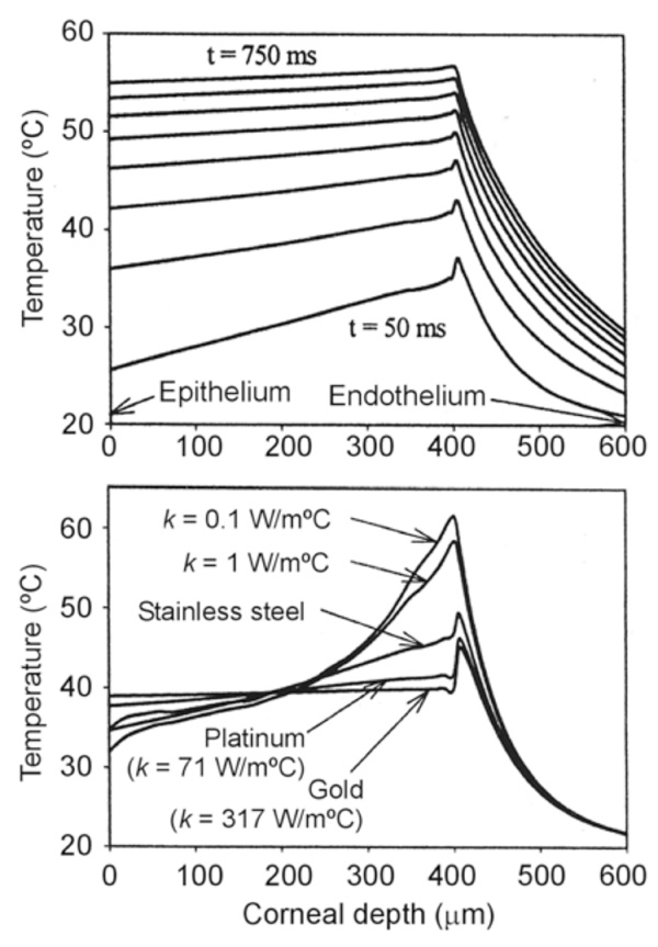We studied the effect of the thermal conductivity of the intrastromal electrode on the temperature profile in the cornea by means of theoretical modeling [40]. Fig. 5 shows the temperature profiles for intrastromal electrodes made from different materials, confirming the importance of the electrode body in diffusing the heat created at the electrode tip.