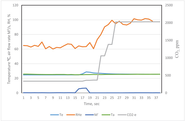 Fig. (10). Revised curves for temperature of ambient air, air flow rate, temperature, relative humidity and CO2 concentration of exhaled breath gas for a test participant after running for 5 min. Te, the exhaled air temperature in °C, RHe, the exhaled air relative humidity in % M’ is the air flow rate in m3/s, Ta is the ambient air temperature in °C, CO2-e is the CO2 concentration of ambient air in ppm.