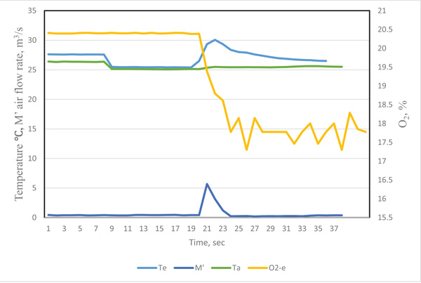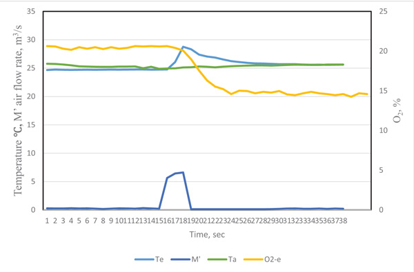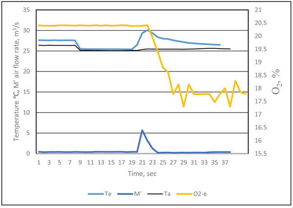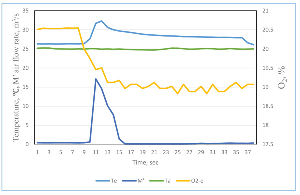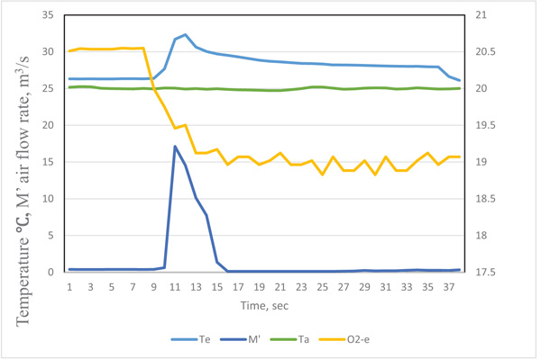 Fig. (11). Revised curves for temperature of ambient air, air flow rate, temperature O2 concentration of exhaled breath gas for a test participant after runing for 5 min. Te, the exhaled air temperature in °C, M’ is the air flow rate in m3/s, Ta is the ambient air temperature in °C, O2-e is the O2 concentration of the exhaled air in %.