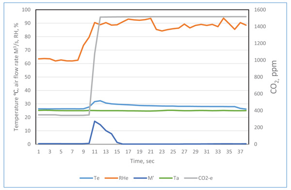 Fig. (4). Revised curves for temperature of ambient air, air flow rate, temperature, relative humidity and CO2 concentration of exhaled breath gas for a test participant in the resting state. Te, the exhaled air temperature in °C, RHe, the exhaled air relative humidity in % M’ is the air flow rate in m3/s, Ta is the ambient air temperature in °C, CO2-e is the CO2 concentration of ambient air in ppm.