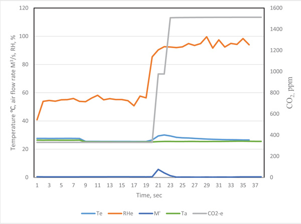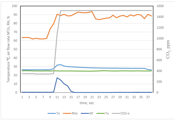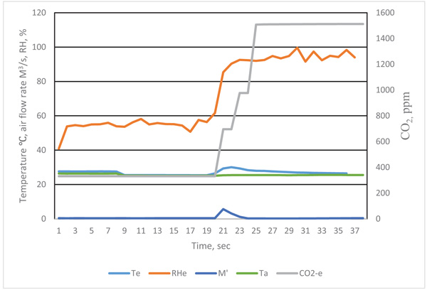 Fig. (6). Typical curves for temperature of ambient air, air flow rate, temperature, relative humidity and CO2 concentration of exhaled breath gas for a test participant after walking for 5 min.Te, the exhaled air temperature in °C, RHe, the exhaled air relative humidity in % M’ is the air flow rate in m3/s, Ta is the ambient air temperature in °C, CO2-e is the CO2 concentration of ambient air in ppm.