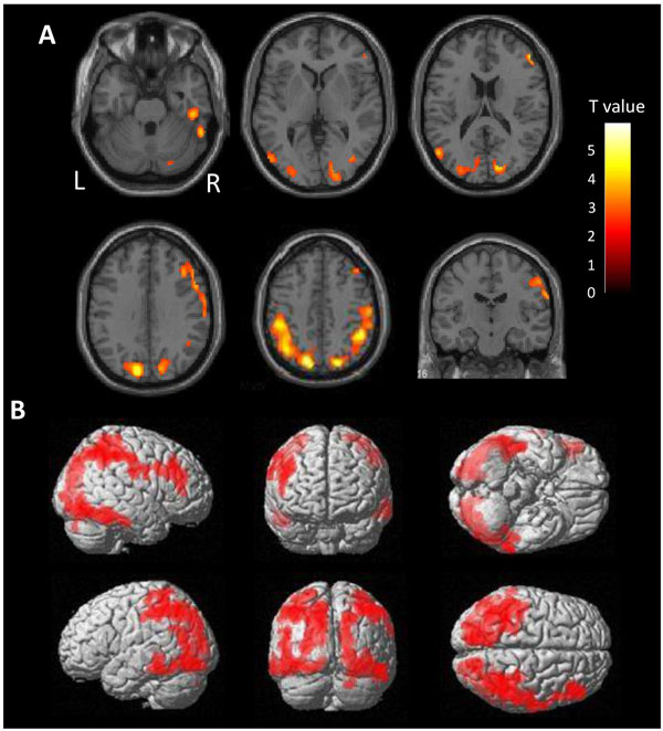 Fig. (2). Group comparison between the group with ANDE (n=7) and HC (n=12). A. Significantly high accumulation of tau is observed in large area of bilateral parietal cortices and limited area of the right frontal lobe. B. Cortical projection of SPM analysis reveals significant accumulation of tau diffusely (red: p<0.01).