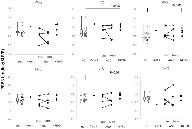 Fig. (3). Regional [11C]PBB3 SUVR values in ANDE and HC. Significantly high accumulation was found in the parietal cortex, precuneus and the lateral temporal cortex of NFTPD (p<0.05). To evaluate effect of atrophy on apparent [11C]PBB3 accumulation, each side was separately analyzed in cases with AGD. Less/ More indicate side of less or more atrophy on MRI. No correlation was found. Open square indicates significantly high accumulation compared to NC.