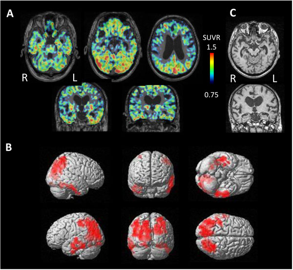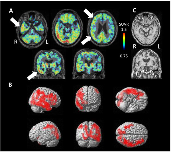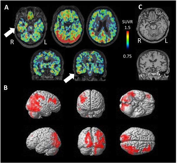 Fig. (4). Tau PET of Case1 (autopsy case). (A) High accumulation of tau was found on the right side of the parietal, frontal and lateral temporal lobes (B). Cortical atrophy was predominant on the left side (C).