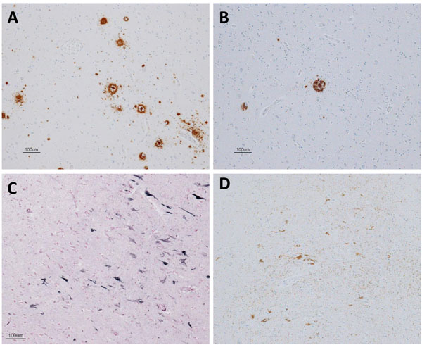 Fig. (5). Very limited number of senile plaques positive for Aβ11-28 were found in the temporal lobe (A) and parietal lobe (B). Neurofibrillary tangle was moderately found in the parahippocampal gyrus (Gallyas staining) (C) and was positive for AT8 staining for phosphorylated tau (D).
