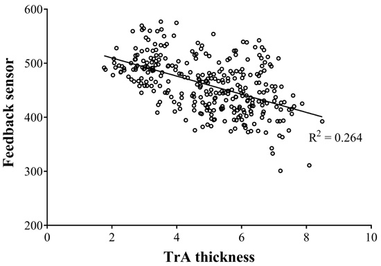 | Feedback Sensor device vs TrA thickness | - 0.514 | < 0.001 |