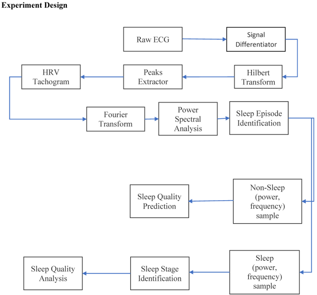 Predicting Sleep Quality (SQ) requires the ability to forecast future inputs for the “sleep stage” classification model since Sleep Quality (SQ) is a function of the time spent in the sleep stages. The higher the amount of time spent in stage 3-5, the higher the SQ value. The goal is to demonstrate that the power spectrum derived from the ECG signal of an individual can be learned by a regression model and used to forecast future trends which are then classified by a Support Vector Machine (SVM) model and evaluated as a Sleep Quality (SQ) value using the equation below: