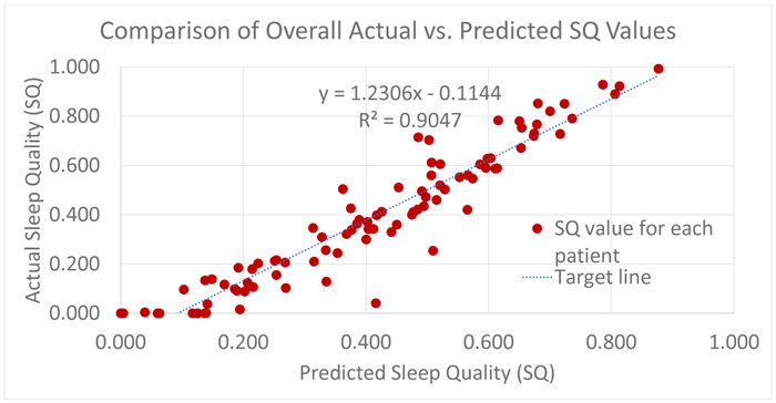 Fig. (5) represents a plot of the overall Sleep Quality (SQ) model for all patients in the test set. It is obtained by plotting actual Sleep Quality (SQ) values computed from clinical annotations against the Sleep Quality (SQ) values from the predicted hypnogram. Recall, that the Sleep Quality formula, is a function from the predicted sleep hypnogram to the interval (0, 1) and as a result, the values computed from clinical annotations as well as predicted by the Sleep Quality (SQ) model are consistently between 0 and 1. Although, an informal notion can be introduced to view computed SQ values as probabilities if the outcome is viewed like a Bernoulli trial with binary realizations {good sleep, bad sleep}, SQ values are actually a measure of the goodness or quality of a sleep episode, with 1 being the best sleep possible [9, 13, 14].