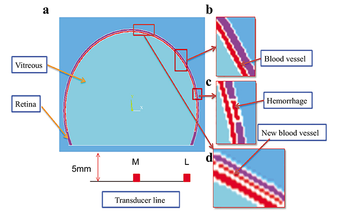 We constructed three human eye models based on literature anatomical data [7]. The eye models consisted of seven structures: cornea, crystalline lens, aqueous humor fluid, vitreous body, retina, choroid, and sclera (Fig. 1a). The first model (case 1), represents a normal eye with four retinal blood vessel branches, each having a diameter of 0.2 mm (Fig. 1b). This model was further modified by adding a random distribution of small blot HEMS with dimensions of (0.1mm × 0.2mm × 1mm) and spherical MAs of diameter 0.1 mm representing NPDR eye (case 2) (Fig. 1c). Finally, the third model (case 3) exhibited an additional formation of small new blood vessels having a diameter of 0.1 mm representing the PDR eye (Fig. 1d).