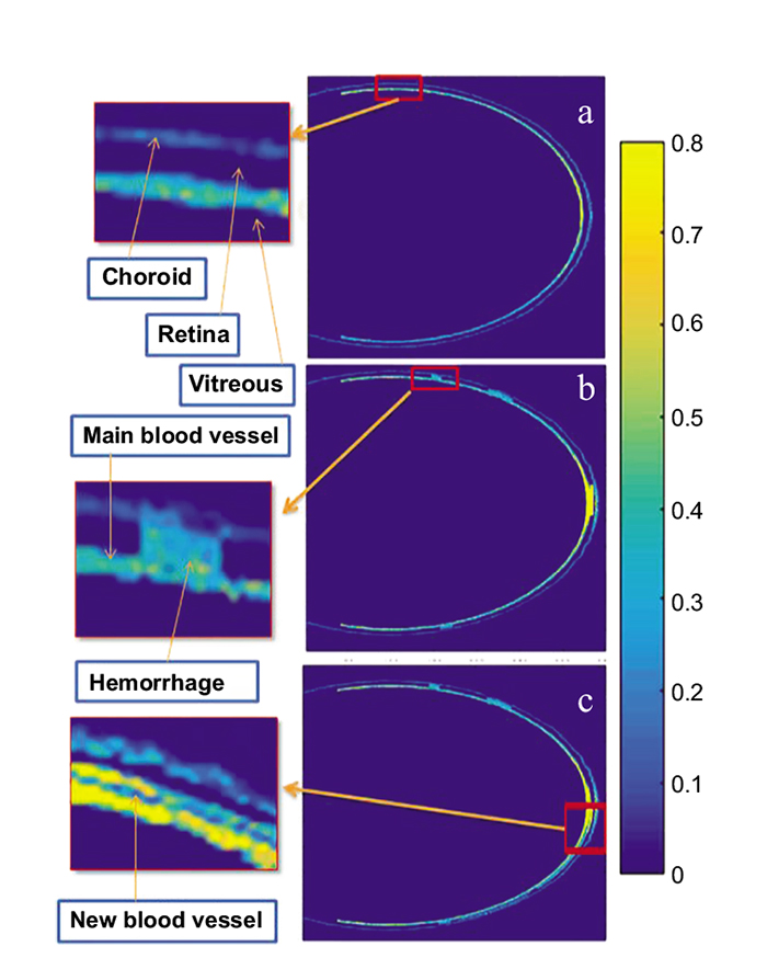The results showed that there is a significant change in the amplitude of the detected PA signal for abnormal eye tissues in the retina (P < 0.05) as compared to healthy eye tissues. The maximum amplitude of the received PA signal in the NPDR and the PDR eye models is 5% and 33%, respectively, which are greater than those observed in the healthy eye.