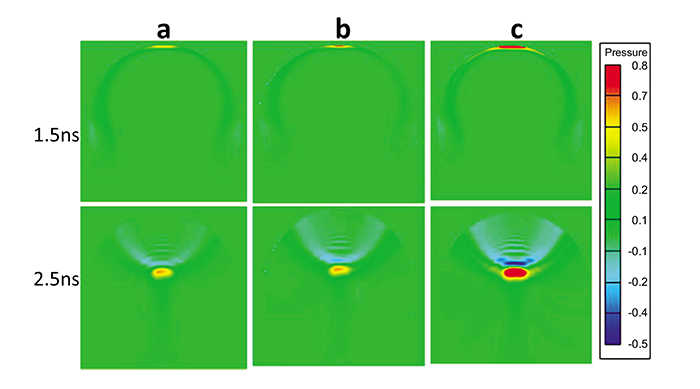 Fig. (5) shows the 2-D time evolution of the propagation of the PA wave at different time instants for the three eye models. Absorbed light energy by centrally located blood vessels, hemhorrages and new vessels are higher than the absorbed energy by those located at the periphery, thus exhibiting maxima in the PA wave pattern at 1.5 ns. As time evolves, the generated PA wave, focused by the retina, tends to propagate in the vitreous fluid towards the transducer, as shown in the lower row of Fig. (5).
