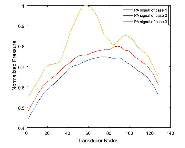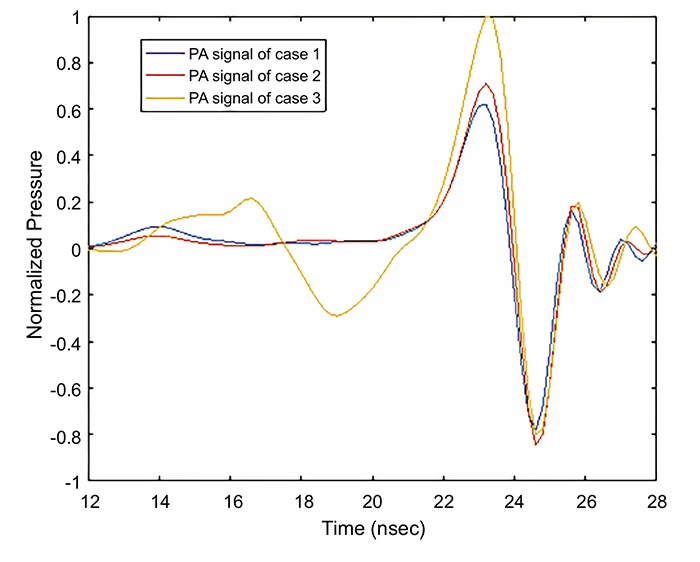 Fig. (6) shows the received PA signal for each model by the central transducer element that was placed 5 mm from the retina. It was observed that the maximum amplitude of the PA signals in case 2 and case 3 are 14.5% and 59.75% higher than the maximum amplitude in case 1. The Normalized full-width half-maximum (FWHM) of the main positive PA signal is higher for case 3 and case 2 as compared to case1, having values of 1: 0.9645: 0.8511, respectively. This is attributed to the accumulation of the received PA wave by the central element of the transducer, as this accumulation in case 2 and case 3 is higher than that in case 1. Note that the positive cycle of the PA signal was generated during the expansion process of the blood vessels and abnormalities, while the negative cycle was generated during the shrinking process of the blood vessel. The received PA signals were scaled to compensate for the effect of the eye model dimensions, being larger than the real eye dimensions.