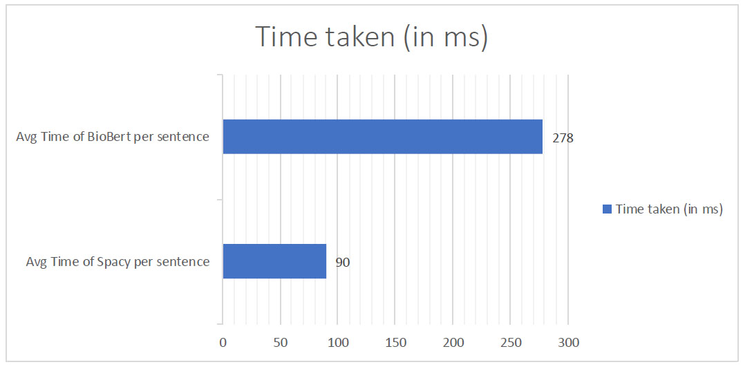 The evaluation of inference times revealed that SCISpaCy processed an average sentence in approximately 90 milliseconds, while BioBERT required an average of 278 milliseconds per sentence as shown in Fig. (2). It is important to note that the relatively longer inference time of BioBERT can be attributed to various internal tasks, including tokenizer loading and token classification.