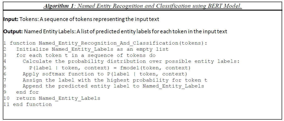 Through the use of these methodologies, scholars have successfully enhanced the precision of Named Entity Recognition models when applied to clinical material containing abbreviations and acronyms. As an illustration, a research investigation on clinical named entity identification attained an F1-score of 0.91 on the 2018 National NLP Clinical Challenges (n2c2) shared task [27, 50]. When applied to the field of biomedical research, the Biomedical Named Entity Recognition (BioNER) technique is an essential part of the process of biomedical text mining [44, 64-66]. The enormous task of recognising and categorising the numerous things that can be found in biomedical literature is taken on by BioNER. These entities include genes, diseases, chemical names, and medicinal names. The ever-increasing number of biological entities, their plethora of synonyms, the popularity of abbreviations, the use of lengthy entity descriptions, and the combination of letters, symbols, and punctuation within these texts all contribute to this complexity. BioNER, integral to numerous applications in the field of natural language processing, plays a pivotal role in biomedical literature mining [25, 67, 68]. One prominent application involves biomedical relation extraction, which seeks to uncover intricate relationships between diverse biomedical entities, such as diseases, genes, species, and chemicals. The accuracy and quality of downstream relation extraction tasks are directly contingent on the performance of BioNER systems [69]. Furthermore, BioNER significantly contributes to the identification and classification of drugs and their interactions, critical for applications like drug discovery, drug safety monitoring, and personalized medicine [70]. It also facilitates knowledge base completion, enriching biomedical knowledge bases by automatically extracting and categorizing pertinent entities from text. This enriched knowledge is then harnessed for a multitude of purposes, including semantic search, question answering, and data integration. BioNER's utility extends to biomedical question answering, assisting in understanding and responding to complex biomedical queries by identifying and categorizing relevant entities from both the question and the relevant text [71]. In the realm of biomedical text summarization, BioNER proves invaluable in identifying and extracting key biomedical entities from texts, thereby enabling the generation of concise, informative summaries [71]. Moreover, it enhances the accuracy and relevance of search results in biomedical information retrieval systems, where it identifies and classifies pertinent entities in both the query and the document collection [51, 67, 71, 72]. A simplified representation for identifying a Named entity can be represented as shown in Algorithm 1