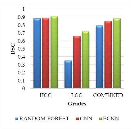 The Challenge dataset for DSC is given in Fig. (7). The Challenge dataset in DSC for the grade HGG in the proposed method ECNN is 0.22 greater than the random forest and 0.20 greater than the CNN. The Challenge dataset in DSC for the grade LGG in the proposed method ECNN is 0.23 greater than the random forest and 0.37 greater than the CNN. The challenge dataset in DSC for the combined grade in the proposed method ECNN is 0.32 greater than the random forest and 0.26 greater than the CNN. The proposed method ECNN has higher values than the CNN and random forest method for all three grades: HGG, LGG, and Combined.