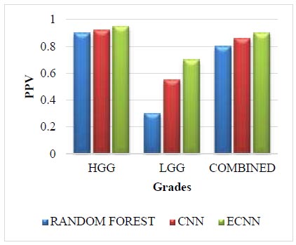 The Challenge dataset for PPV is given in Fig. (8). The Challenge dataset in PPV for the grade HGG in the proposed method ECNN is 0.18 greater than the random forest and 0.14 greater than the CNN. The Challenge dataset in PPV for the grade LGG in the proposed method ECNN is 0.22 greater than the random forest and 0.25 greater than the CNN. The challenge dataset in PPV for the combined grade in the proposed method ECNN is 0.27 greater than the random forest and 0.07 greater than the CNN. The proposed method ECNN has higher values than the CNN and random forest method for all three grades: HGG, LGG, and Combined.