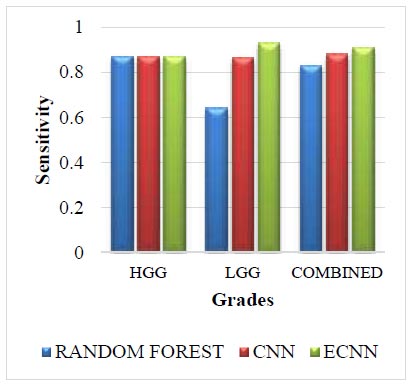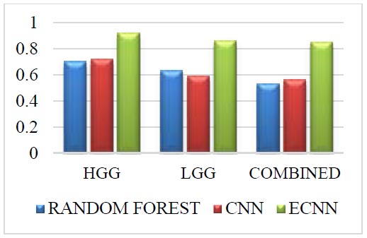 The Challenge dataset for sensitivity is shown in Fig. (9). The Challenge dataset in sensitivity for the grade HGG in the proposed method ECNN is 0.17 greater than the random forest and 0.11 greater than the CNN. The Challenge dataset in sensitivity for the grade LGG in the proposed method ECNN is 0.20 greater than the random forest and 0.13 greater than the CNN. The challenge dataset in sensitivity for the combined grade in the proposed method ECNN is 0.22 greater than the random forest and 0.10 greater than the CNN. The proposed method ECNN has higher values than the CNN and random forest method for all three grades: HGG, LGG, and Combined.