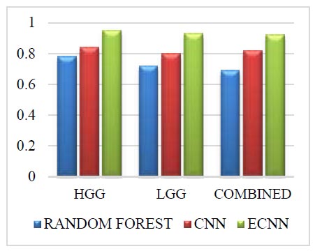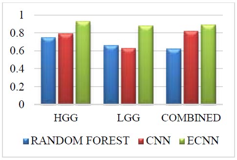 The CHALLENGE dataset for the methods such as random forest, CNN, and ECNN for the grade HGG are listed in Table 3.