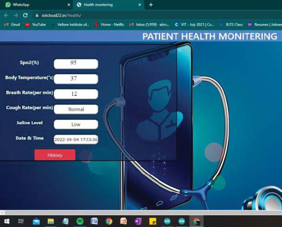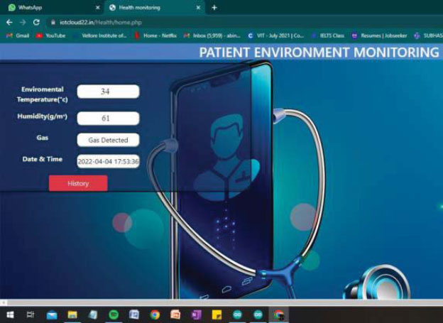 Figs. (10 & 11) are the web pages that we have created to survey the condition of the patient’s health and the environment as well. As you can see for the patient’s body, the following parameters have been measured: