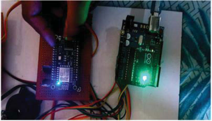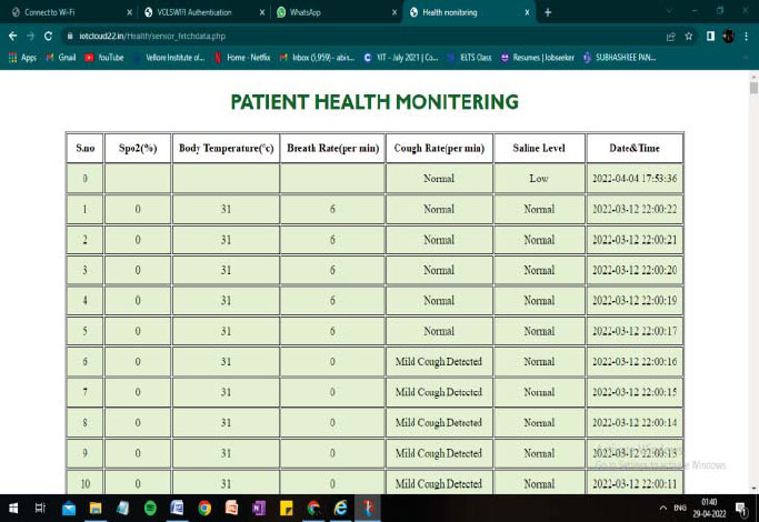 As shown in Figs. (8 and 9), the Arduino UNO and Node MCU both have been connected to the laptop to feed the code for our hardware setup. Both of the LEDs on the Node MCU and microcontroller are glowing, indicating that the code is being transmitted to the boards. The probe has been placed on the finger to measure the SpO2 level of the human body as shown in Fig. (8). Likewise, the breath cuff can be kept on the patient’s body to measure the breathing pattern and cough pattern. Likewise, the parameters measured for the human body, that is, body temperature, SpO2, Saline Level, Cough Pattern, and breathing pattern are monitored and are viewed on the web page and applications as shown in the figure. Similarly, for the environment, the temperature, humidity, and gas detection are monitored and viewed in the same way as well.