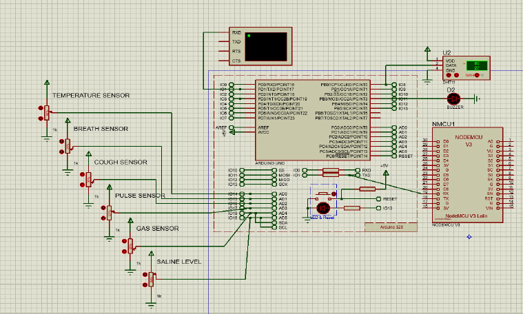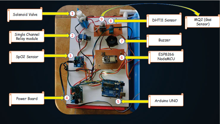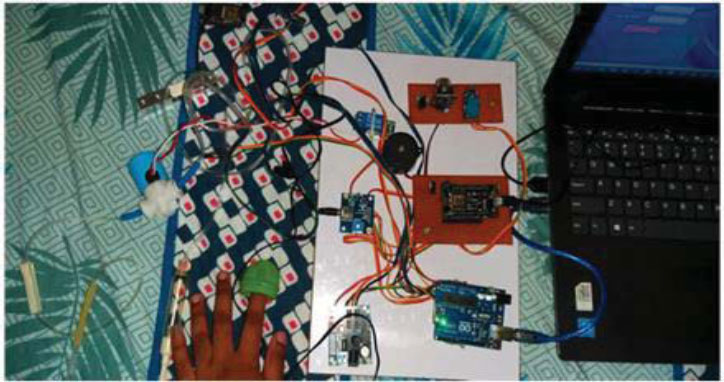 Fig. (2) depicts the Hardware model set for both patients (may it be for COVID patients or general health care) & environment monitoring. The sensors are interfaced with the Arduino which is the microcontroller in the hardware model, where it will be receiving all the inputs from the sensors. The buzzer is kept for alerting in case of any emergencies or any help needed.