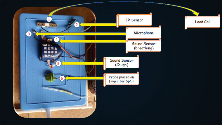 (ii) The next parts, 3, 4, and 5 are for breathing & coughing monitoring mechanisms. Two sound sensors are placed on either side of the mask, one for Coughing detection & the other for breathing purposes. A microphone positioned over the neck can detect the fluctuation of sound and be used to assess respiratory sound. Frequency analysis and loudness estimate may be done using this information. The 6th one is a probe that is placed on the finger for SpO2 reading (which is responsible for showing the percentage of oxygen in human blood).