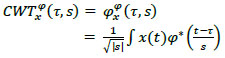 The PPG signal, akin to the arterial blood pressure signal, exhibits distinct systolic and diastolic points. While the time domain signal captures the morphological features, it lacks frequency information. Fourier transform, on the other hand, offers frequency information but does not provide detailed time domain features. This limitation is addressed by the Continuous Wavelet Transform (CWT), represented by the following expression.