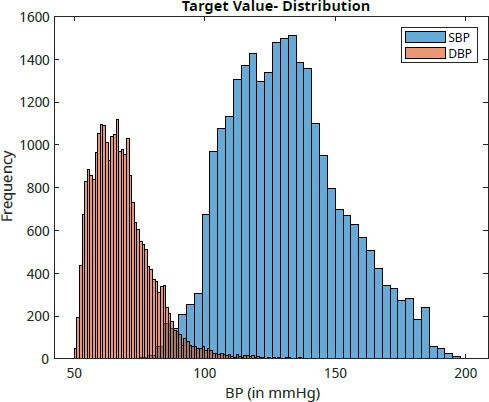 Fig. (2) illustrates the distribution of systolic and diastolic BP target values in the training dataset. For model training, 80% of the total 27,102 PPG segments, along with their corresponding SBP and DBP values, are employed.