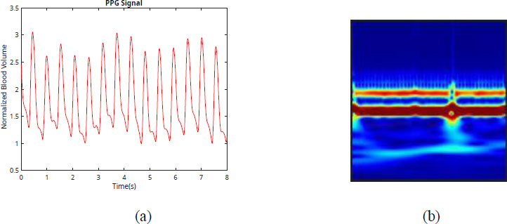 Fig. (3a) shows the PPG signal from the dataset and its corresponding wavelet coefficient image (Fig. 3b).