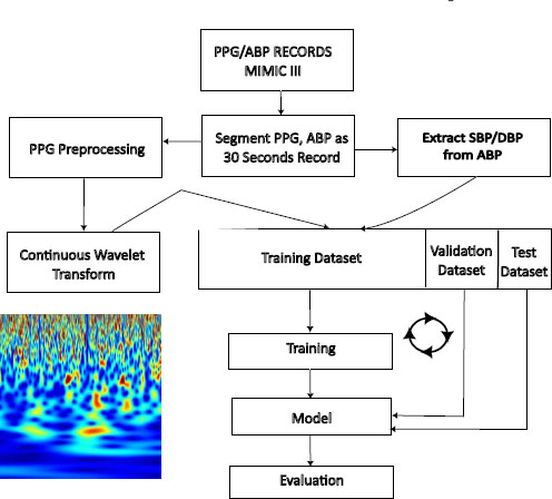 Fig. (4) shows the block diagram of the process of BP estimation from the PPG scalogram using CNN. The PPG signal undergoes segmentation into 24-second records, with segments shorter than this duration being discarded. Subsequently, the continuous wavelet transform is computed for these PPG segments, and the resulting coefficients are represented as a two-dimensional RGB image. Simultaneously, the arterial blood pressure (ABP) waveform is also segmented into 24-second waveforms.