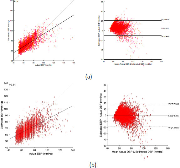 Though the model’s estimation error performance at the higher range of SBP and the lower range of DBP does not change significantly, the RMSE of the proposed CNN-SVR model at the lower range of SBP (65 mmHg -90mmHg) and the higher range of DBP (100 mmHg – 140mmHg) is observed as 18.19 mmHg and 30.59 mmHg. This clearly indicates that the estimation error of the model at a range other than the range specified above is lesser and at the range specified above will be higher.